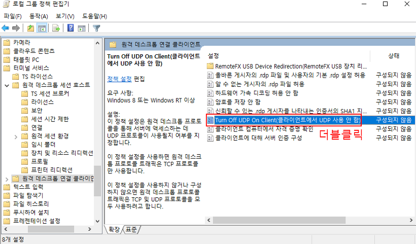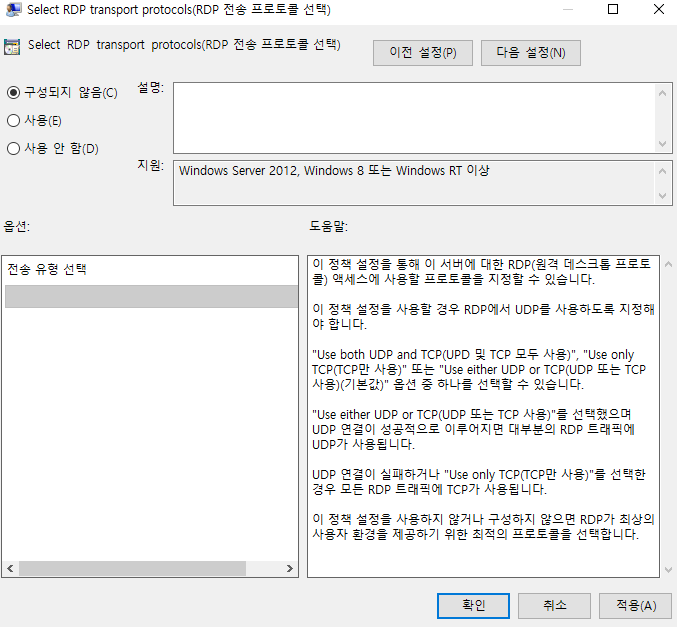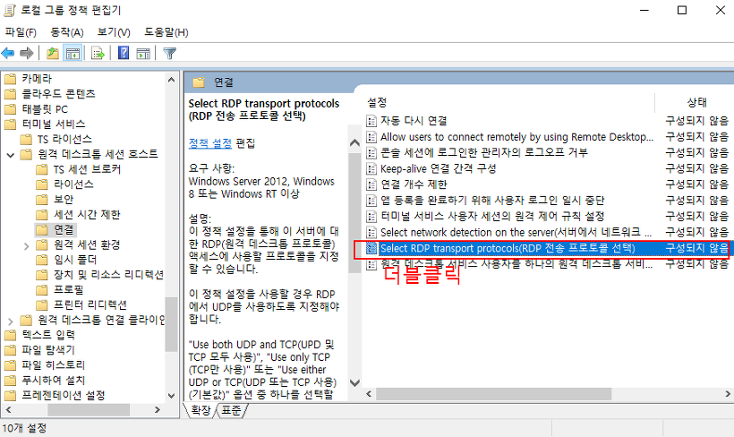 3.Select RDP transport protocols(RDP 전송 프로토콜 선택)을 더블클릭 합니다.