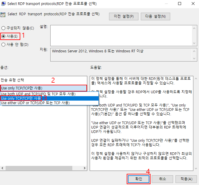 RDP에서 TCP 프로토콜 강제하기 (호스트)