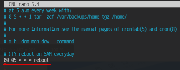 나는 '매일 05:00 AM에 재부팅'하는 작업을 하고자 했으므로 위와 같이 입력하였다.